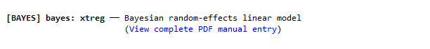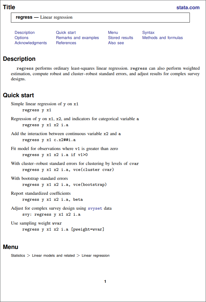 You can also access the PDF entry from Stata’s help files. Each help file has the manual shortcut and entry name in blue, which links to the PDF manual entry, in addition to the "View complete PDF manual entry" link below.