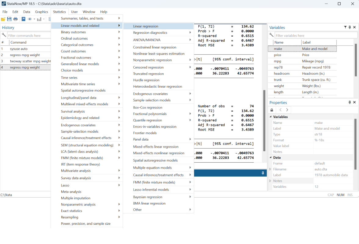 You can access all of Stata's data manipulation, statistical, and visualization features from the menus and associated dialogs.