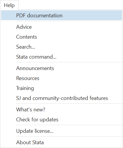 Stata is a big package and so has lots of documentation – over 19,000 pages in 36 volumes. But don't worry, type help my topic, and Stata will search its keywords, indexes, and even community-contributed packages to bring you everything you need to know about your topic. Everything is available right within Stata.